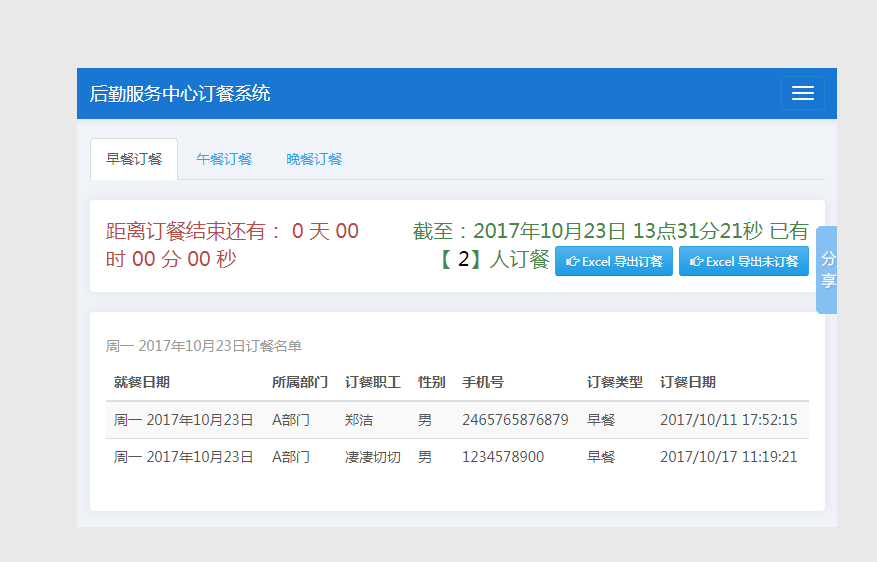 显示当天所有教师早餐、中餐、晚餐的订单详情。
